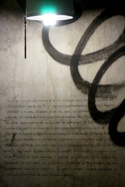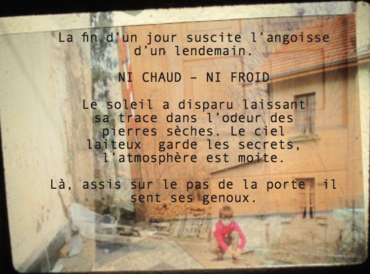 Entre lieux est un travail qui est né d’une collaboration avec Suzanne Perrin, www.suzanneperrin.com. Il s’est déroulé sur une année et quelques mois. Au cours de cette expérience, nous avons traversé divers lieux, tous à proximité de nos lieux de vies, passant ainsi par des villes désoeuvrées, un camping ouvert à l’année, des hôtels, une demeure en attente d’être vendue, des maisons abandonnées, des jardins familiaux, une discothèque brûlée, des abris de fortune, une déchetterie, un bureau des objets trouvés etc... Nous restions dans ces endroits parfois quelques heures, d’autres fois jusqu’à deux jours selon notre besoin d’investigation. Nous avons accumulé au fur et à mesure divers matériaux que nous produisions (prises de notes, de sons, réalisations de vidéos, de photographies, de textes, d’objets plastiques) ou que nous trouvions et récupérions sur place (diapositives, objets du quotidien, photographies, matériaux bruts...).