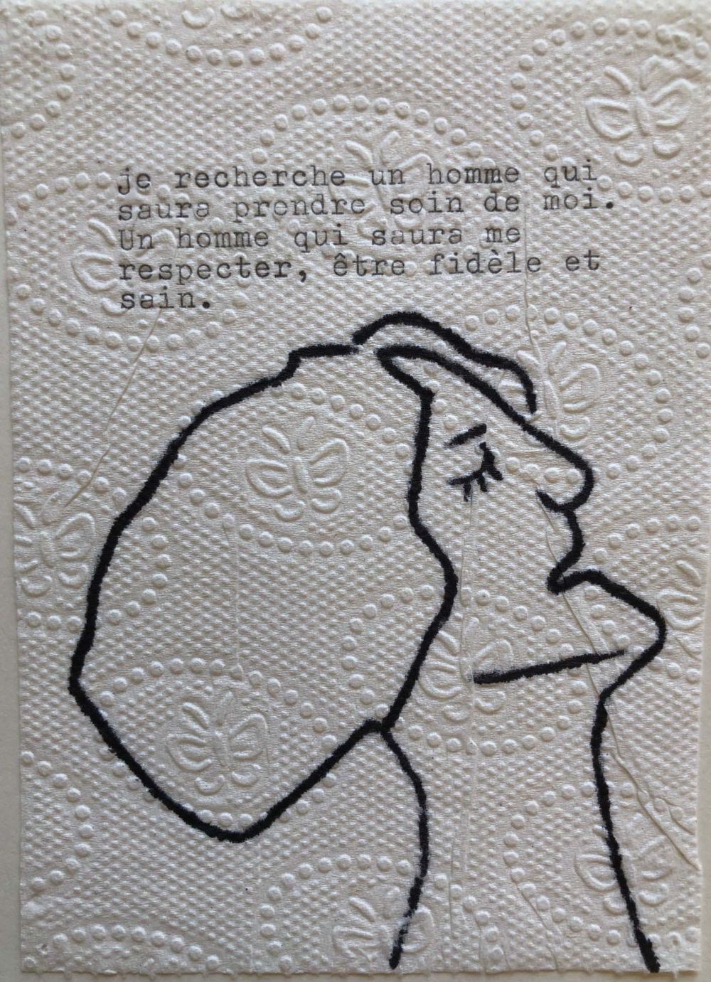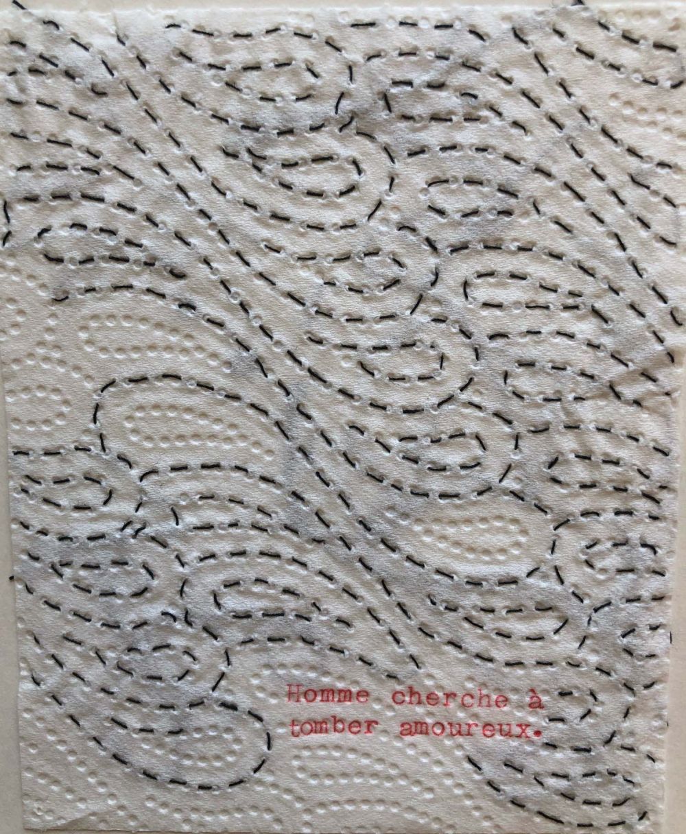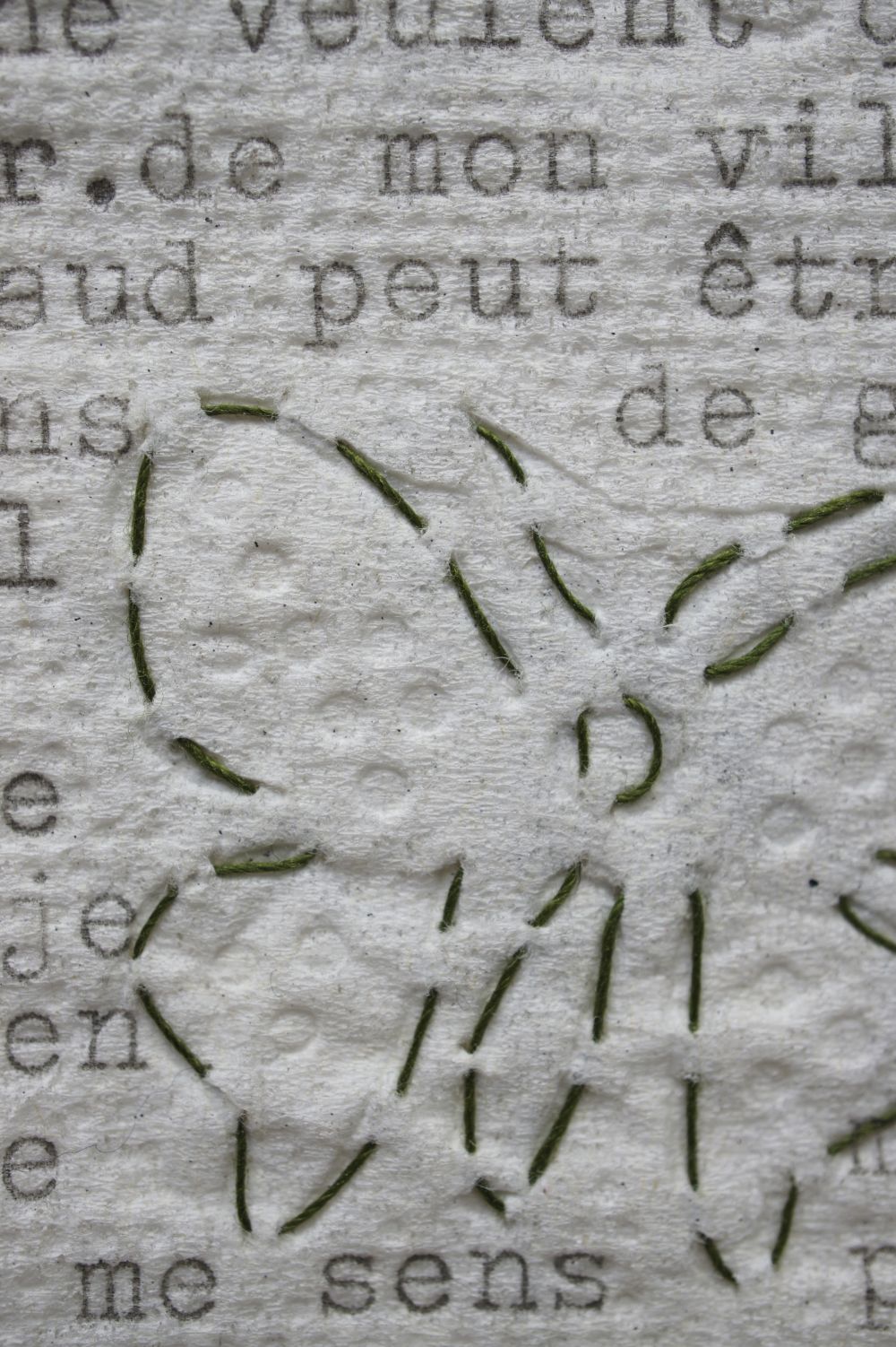 Papier toilette, encre, encre de chine, stylo, fil à coudre.