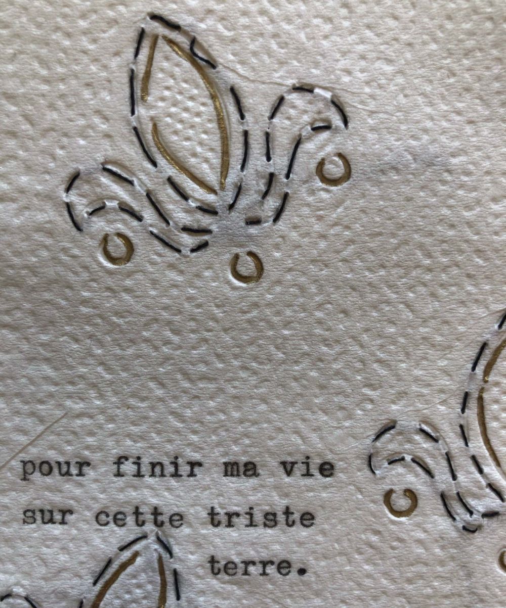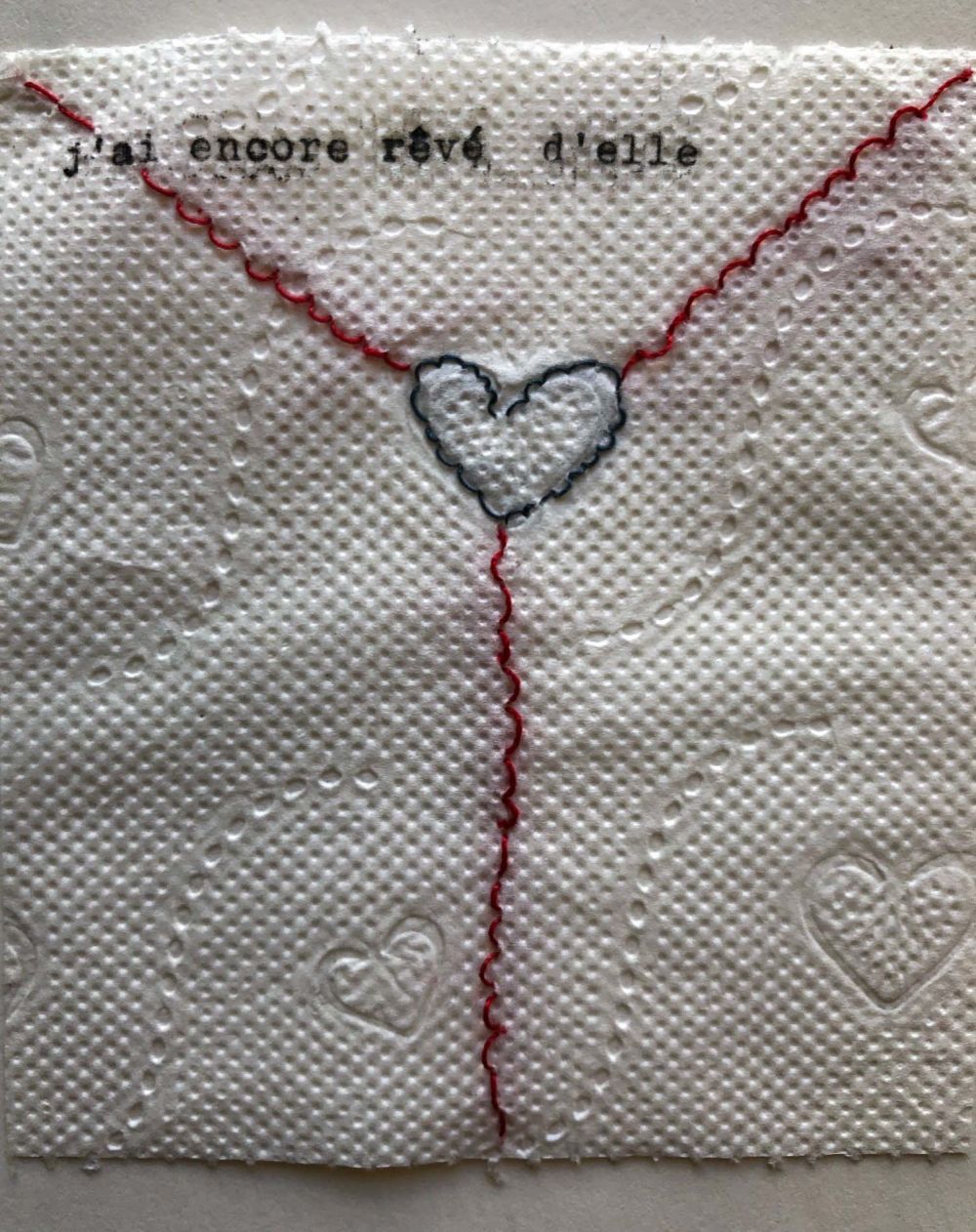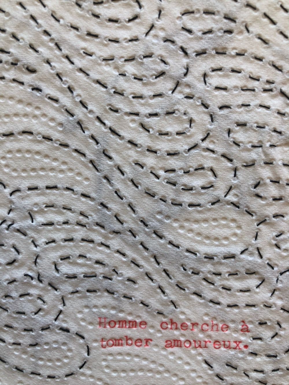 Papier toilette, encre, encre de chine, stylo, fil à coudre.