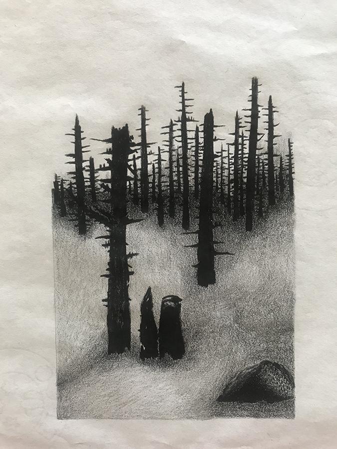 crayons et feutre noir.