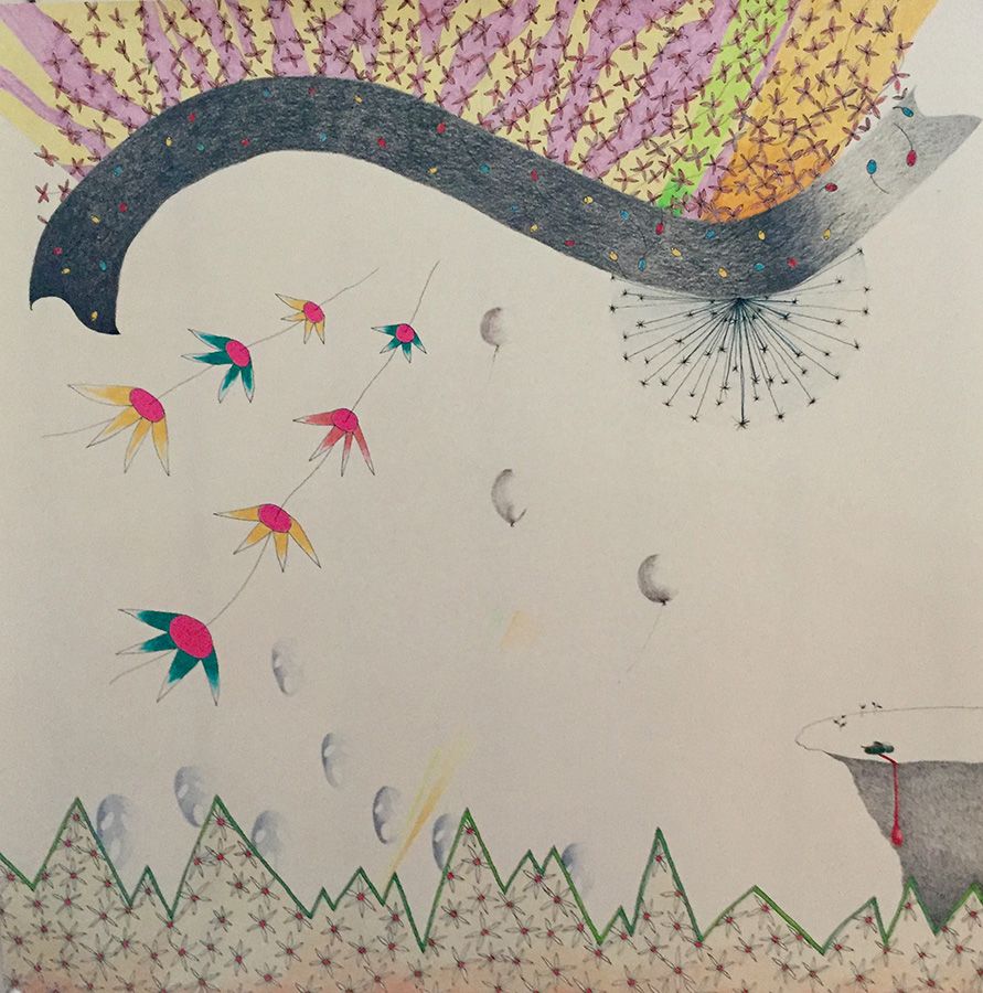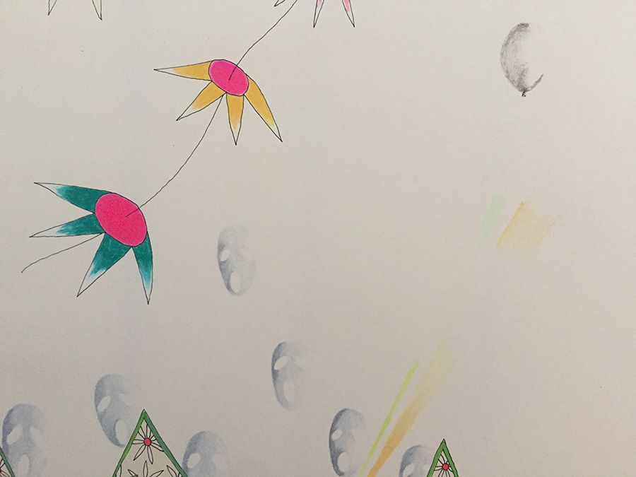 Feutres, crayons de couleur, crayon gris.