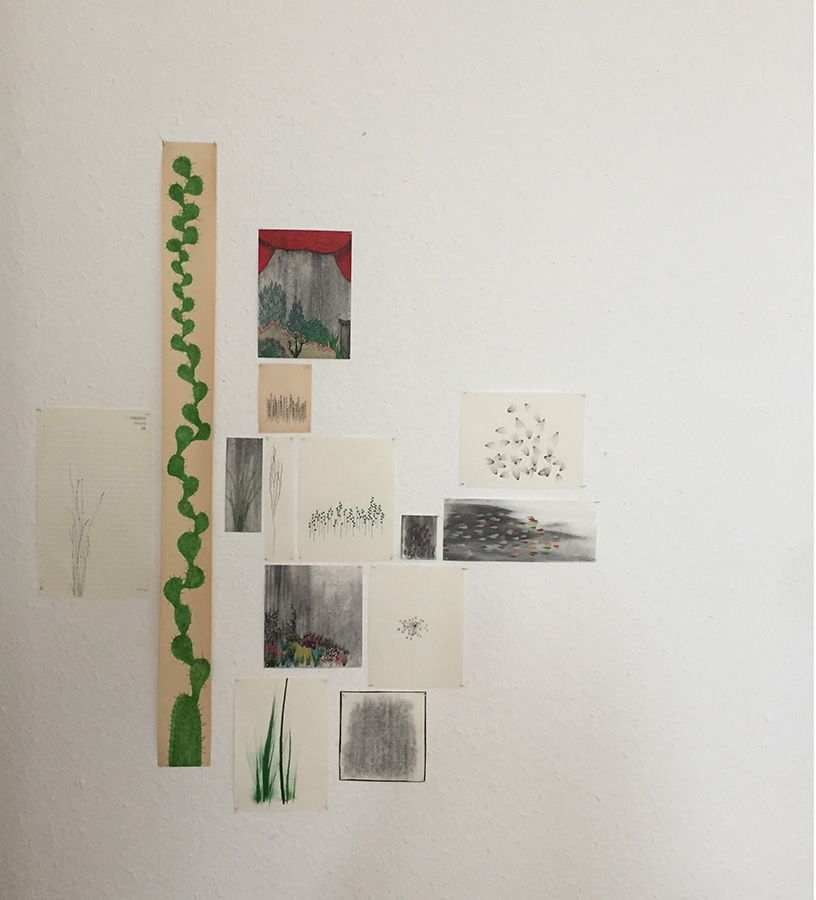 13 dessins à dimensions variables forment une image d'environ 45x40cm